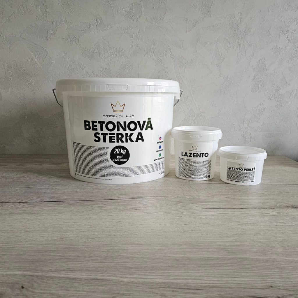 ►Balení: Betonová stěrka 20 kg (10 m² ve dvou vrstvách), LAZENTO 1 kg (10 m² ve dvou vrstvách), LAZENTO PERLEŤ 500 g (10 m² v jedné vrstvě)